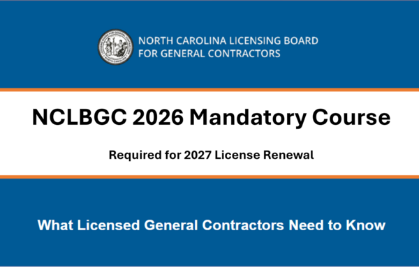 This course, in any of the NCLBGC approved formats (live instruction, synchronous distance-learning instruction, or eLearning) is mandatory for 2026 License Renewal. Please Note: CE credits are uploaded to the Board on Mondays. Courses completed in the system between Monday and Sunday midnight will be posted to the Board on the following Monday. All courses must be completed by Nov 30th at midnight in order to receive CE credits for the calendar year. No courses are offered during the month of December. For product support, please email [email protected] North Carolina General Statute 87-10.2, requires that qualifiers for Building and Residential classifications of North Carolina General Contractor licenses and those designated as Unclassified licenses are required to annually complete 8 hours of Continuing Education (CE) as a condition for license renewal. Accordingly, the North Carolina Licensing Board for General Contractors (NCLBGC) has embarked upon developing and delivering this two (2) hour mandatory CE course. This mandatory course explains the statutes and regulations for which qualifiers and licensees must comply with. Students will review current law, regulations, rules and statutory terminology used by the NCLBGC. Students will also participate in a practical exercise in the application of knowledge they learned and understood during the course. PLEASE READ: You will have 90 days from the date of enrollment to complete this eLearning course. If you are unable to complete the course within 90 days, you will need to retake the entire course. Please contact product support if you have allowed your course to expire. The following system specifications are suggested for the best learning experience. Platform: IBM PC Compatible or Apple Mac computer Operating System: Windows 10 or current Apple IOS Browser: Edge, Chrome, Safari Hardware: Speakers, Mouse, and Keyboard It is also recommended that you complete the course in its entirety once started. In the event you need to leave the course, select "SAVE and EXIT" in the upper right corner of your browser and log out. Launching (starting or resuming) the course in multiple windows at the same time will prevent the system from tracking progress properly. This could require you to repeat the course in order to successfully complete the course. Read more